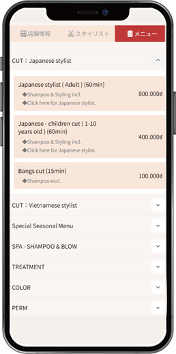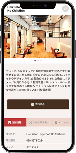 お客様が最初に目にするページで、営業時間や電話番号などの基本情報だけでなく、店舗の雰囲気を伝える写真を掲載可能。サロンの魅力をしっかり伝え、予約につなげます。
