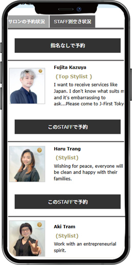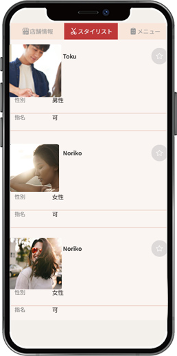 お客様が希望するスタイリストを選べる便利な機能です。経験や専門性をプロフィールから確認し、信頼できる担当者を事前に指定できます。これにより、お客様が満足のいくサービスを受けやすくなり、リピーターの確保や顧客満足度の向上に繋がります。