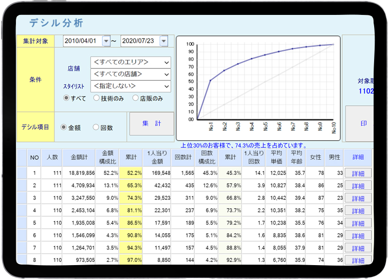 売上や顧客データをもとに、顧客を売上貢献度ごとにグループ化し、重点顧客層を明確化します。この分析を活用することで、効果的なマーケティング施策を立案し、効率的なリソース配分が可能になります。