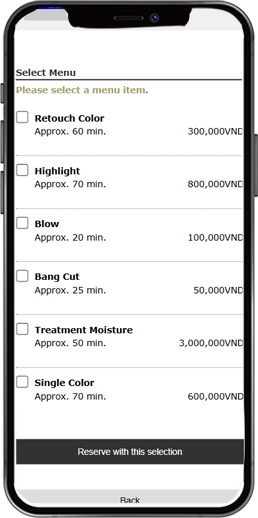 サロンが提供するメニューの中から、お客様が事前に施術内容を選択できます。施術の種類や価格を確認できるため、当日のスムーズなサービス提供が可能です。予約時の混乱や勘違いを防ぎ、スタッフの業務負担を軽減することで、より効率的な運営を実現します。