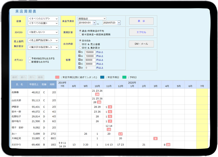 顧客ごとの来店頻度や周期を可視化し、次回予約やリピート促進のタイミングを最適化します。この分析により、適切なフォローアップやプロモーションが可能となり、顧客満足度と再来店率の向上を実現します。