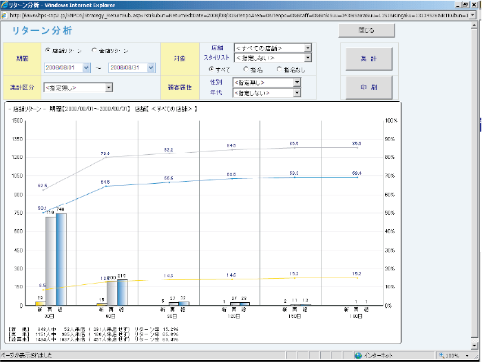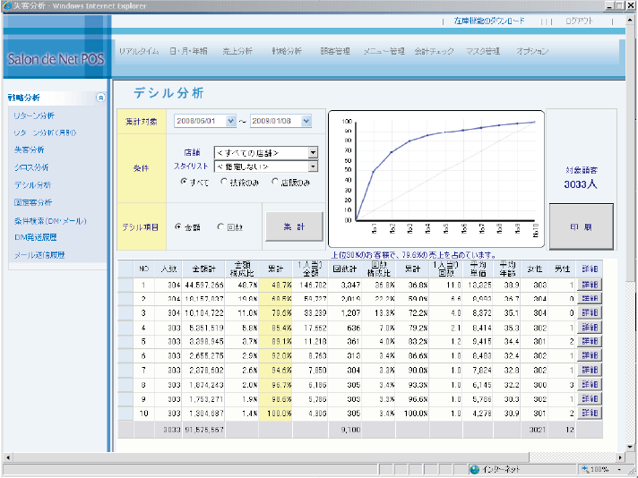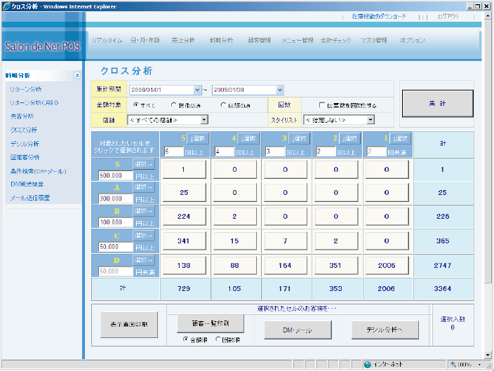 当社のシステムは、美容院経営に必要な多彩な分析機能を搭載しています。クロス分析で顧客属性と人気メニューの関係を可視化し、リターン分析で施策の効果を正確に評価。デシル分析では売上貢献度に応じた顧客の分類が可能で、ライフ分析では新規からリピーターまでの動向を追跡します。これらの分析を駆使することで、売上向上や顧客満足度の向上に貢献。経営戦略の最適化をサポートし、効率的で成果の出る店舗運営を実現します。