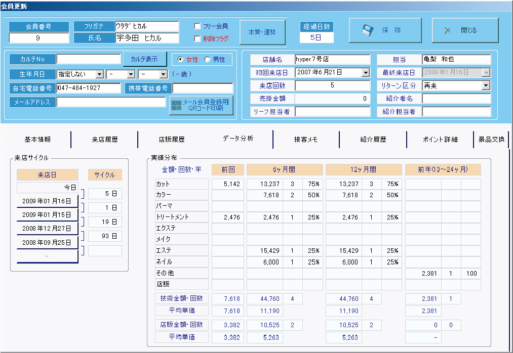 顧客の来店サイクルや過去の利用履歴を詳細に表示する顧客情報画面は、パーソナライズされたサービス提供を可能にします。データの視覚化により、顧客の好みや傾向を把握しやすく、リピート率向上や効果的なマーケティング施策に活用できます。さらに、顧客ごとの履歴管理が簡単に行え、接客の質を高めるための強力なツールとなります。