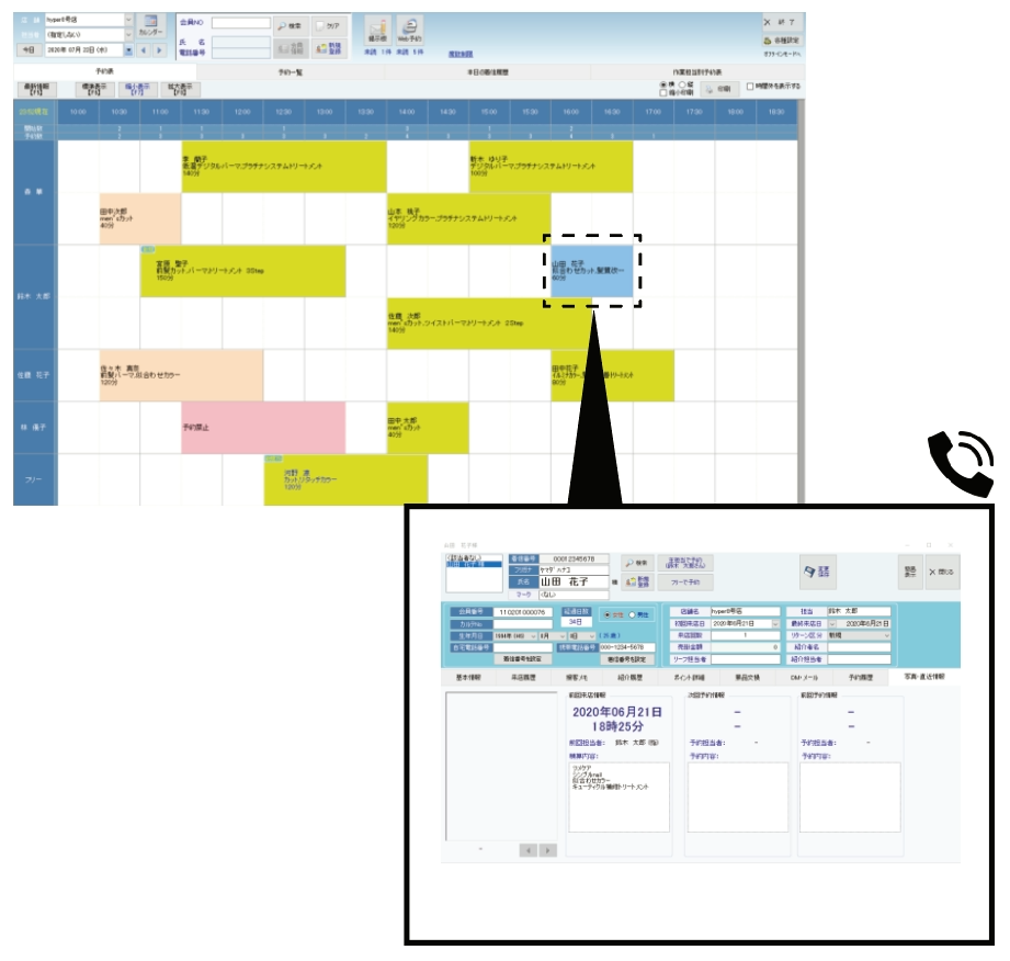 電話の着信時にお客様の情報を画面に即座に表示することで、迅速で正確な対応を可能にします。お客様の予約履歴や基本情報が一目で確認できるため、無駄な確認作業を省き、効率的なコミュニケーションをサポートします。この機能により、スタッフは着信内容に応じた最適な対応ができるようになり、顧客満足度の向上にも貢献します。